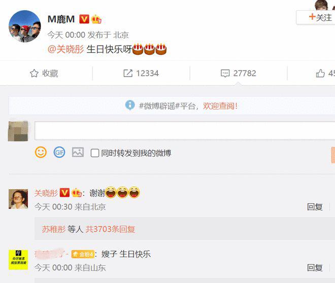 网易娱乐 9 月 17 日报道 9 月 17 日是关晓彤的生日,鹿晗零点卡点发博为关晓彤庆生。随后,关晓彤在评论区回复 " 谢谢 "。网友们更是将 " 嫂子,生日快乐 " 的评论顶上了热评,位置仅在关晓彤之下。