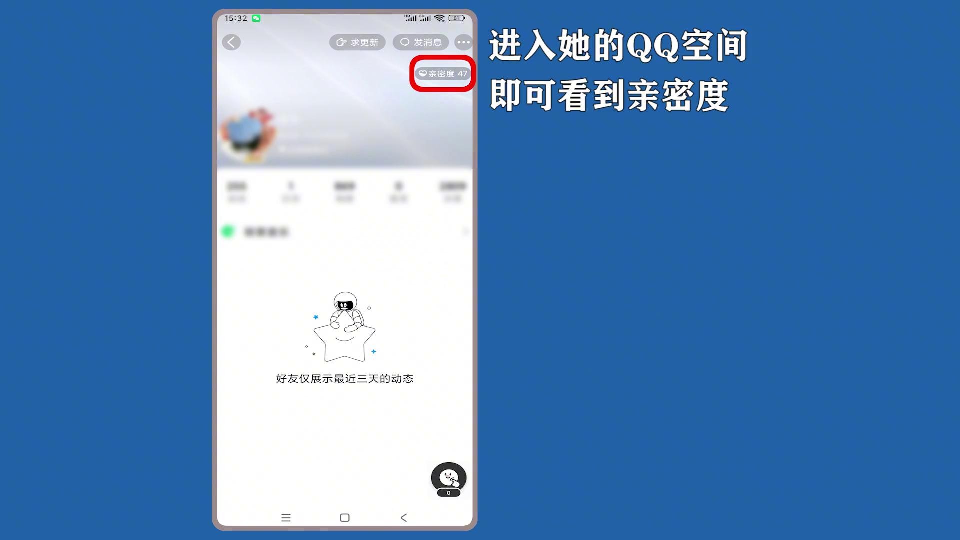 ·打开手机"qq"一点选"好友",点击"三条横杠"→点击"好友头像"→点击"她的QQ空间"→进入她的QQ空间即可看到亲密度。