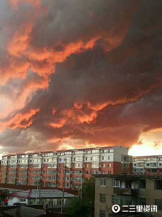 5月26日晚7时左右,在吉林舒兰市吉舒镇天空出现火烧云奇异天象,很多人纷纷拿出手机拍摄。