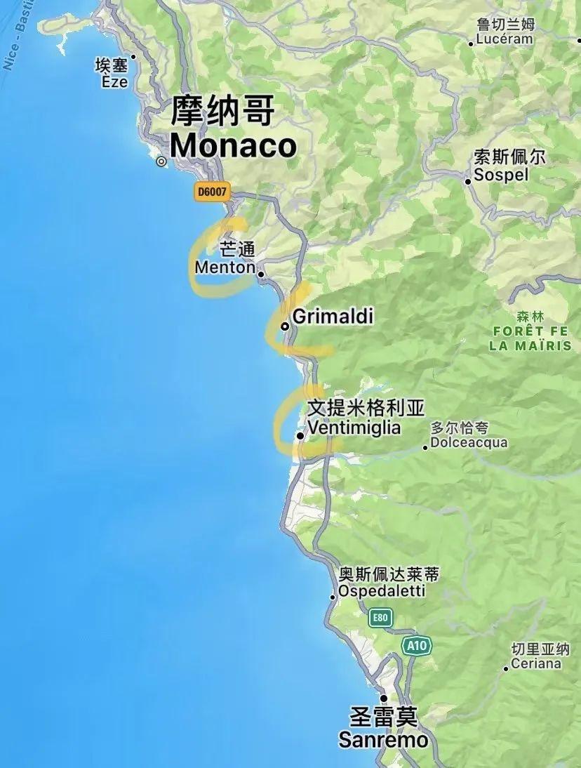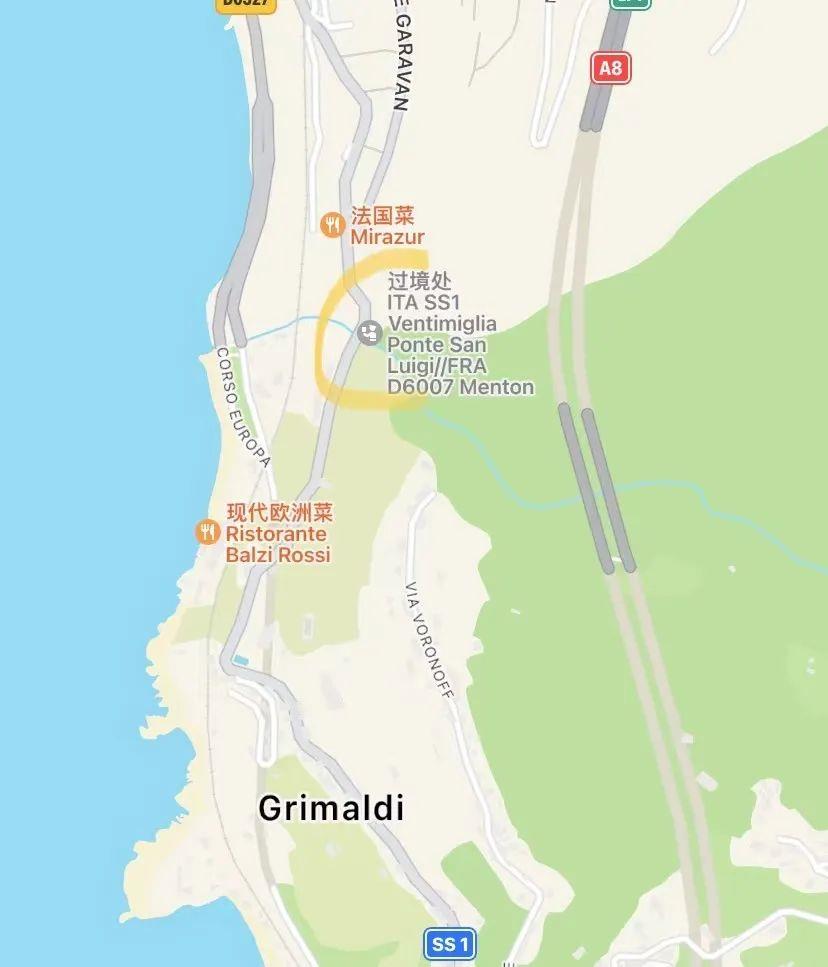 明信片的图景就是两城之间的“海关”要道,Grimaldi这个地方,通过在地图放大后,至今仍有此处,见图四。