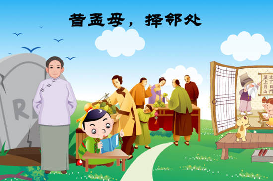 孟母三迁在三字经中以“昔孟母,择邻处”呈现,意思是孟母为了给孟子营造一个良好的学习环境,而三次搬迁,经过数千年的流传,现代社会中也常用这个成语来表示父母对子女的良苦用心、竭尽全力的培养孩子。