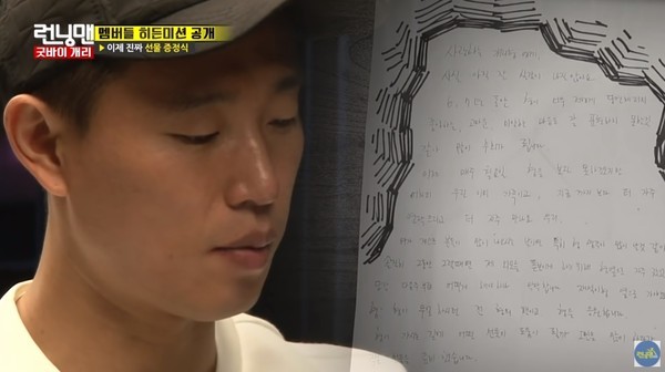 《Running Man》日前释出李光洙录影最后一集的预告影片,标题写着「『Goodbye』光洙想传达的最后故事」,他颤抖着声音准备念着手写信,哽咽对大家说「对不起...」便低下头来,镜头也照到一旁的金钟国、宋智孝与梁世灿,有人红了眼眶、有人抿嘴压抑情绪,也有人鼻头已经泛红,预计今晚将会逼哭不少《RM》铁粉。