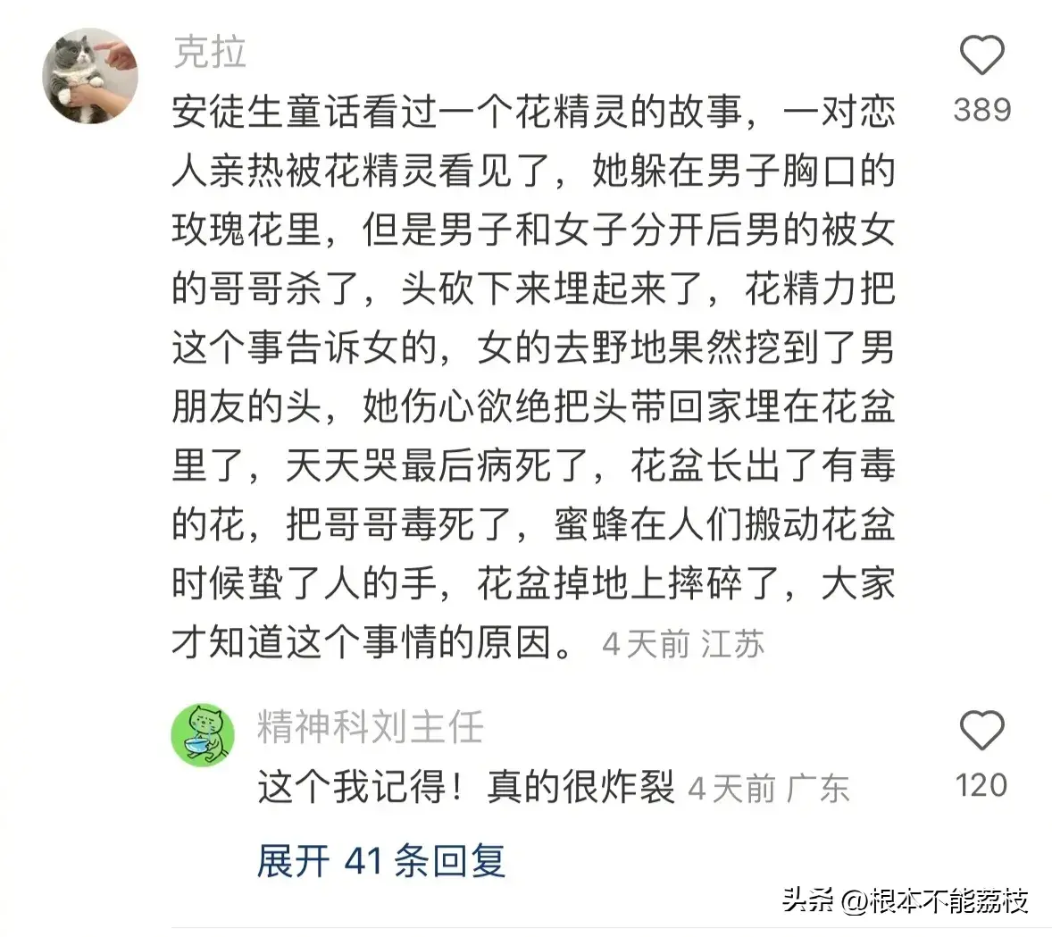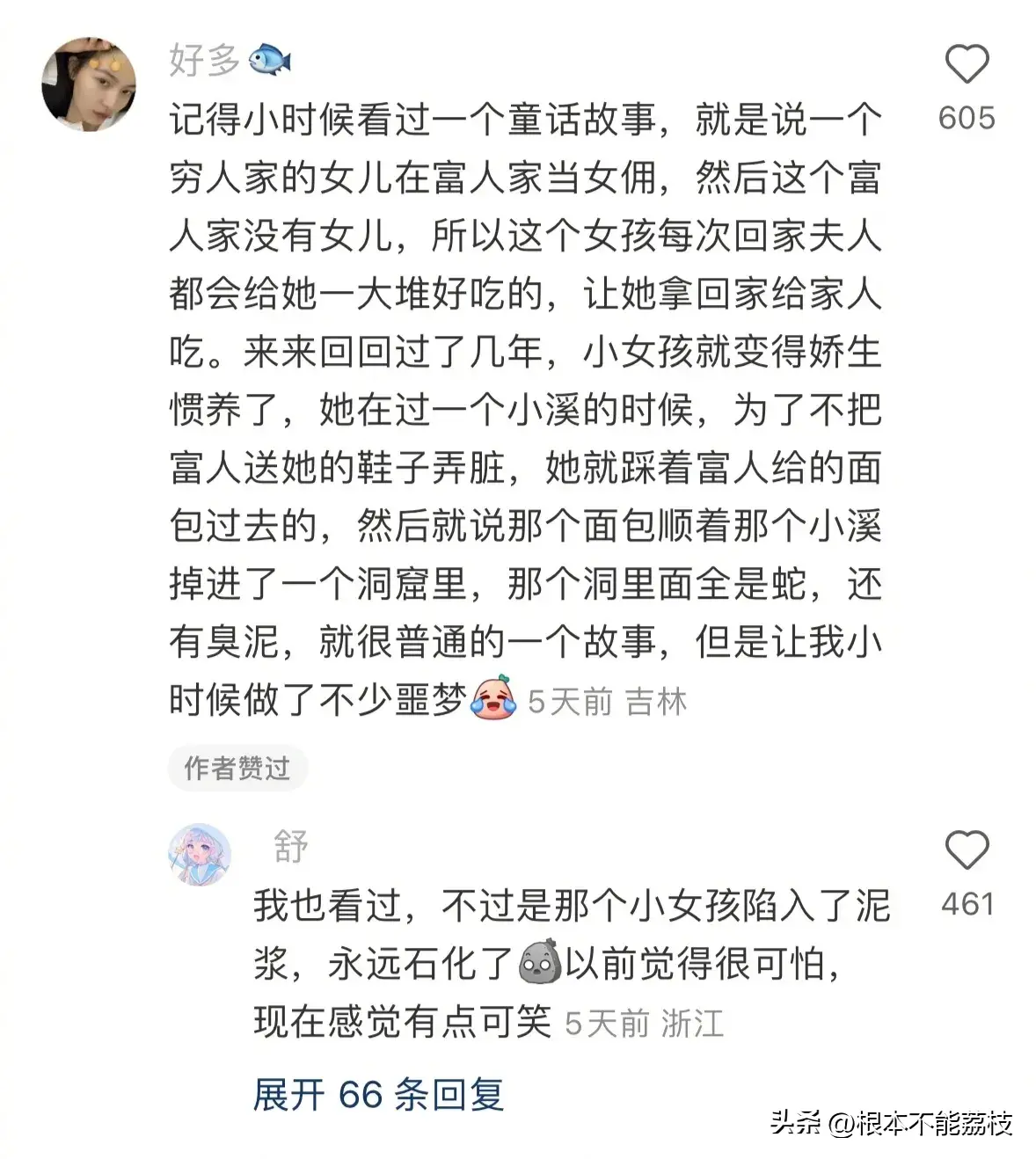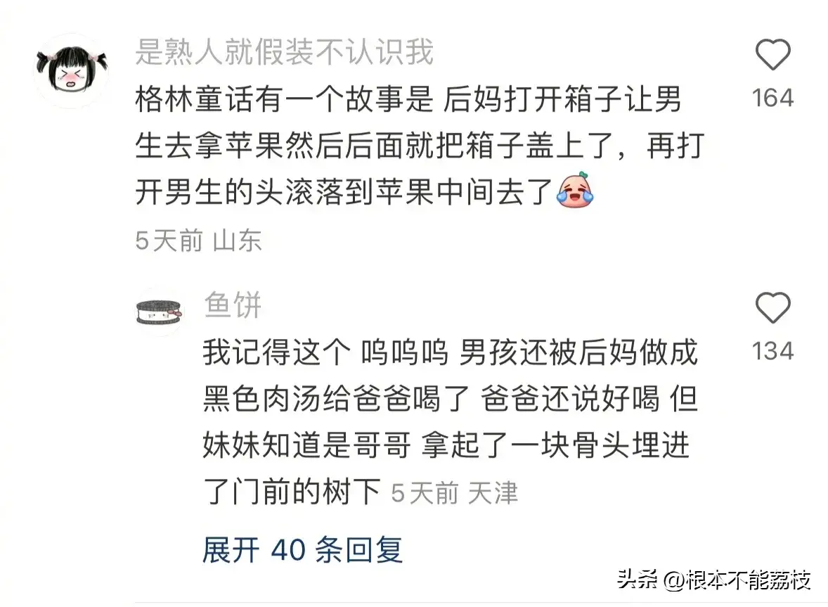 网友3: 童话故事里反派的下场都挺惊悚的,好像灰姑娘的继母是在婚礼上被要求穿着烧红的铁鞋跳舞,然后还有哪个公主故事的反派被装进钉满钉子的桶滚下了山坡,小时候只觉得结局大团圆,反派活该 但是这些手段真的很残忍。