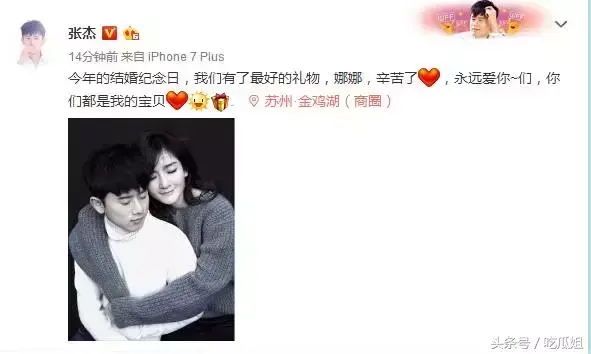 今天是张杰跟谢娜的结婚纪念日,早上张杰发了一条微博:今年的结婚纪念日,我们有了最好的礼物,娜娜,辛苦了!永远爱你们,你们都是我的宝贝。