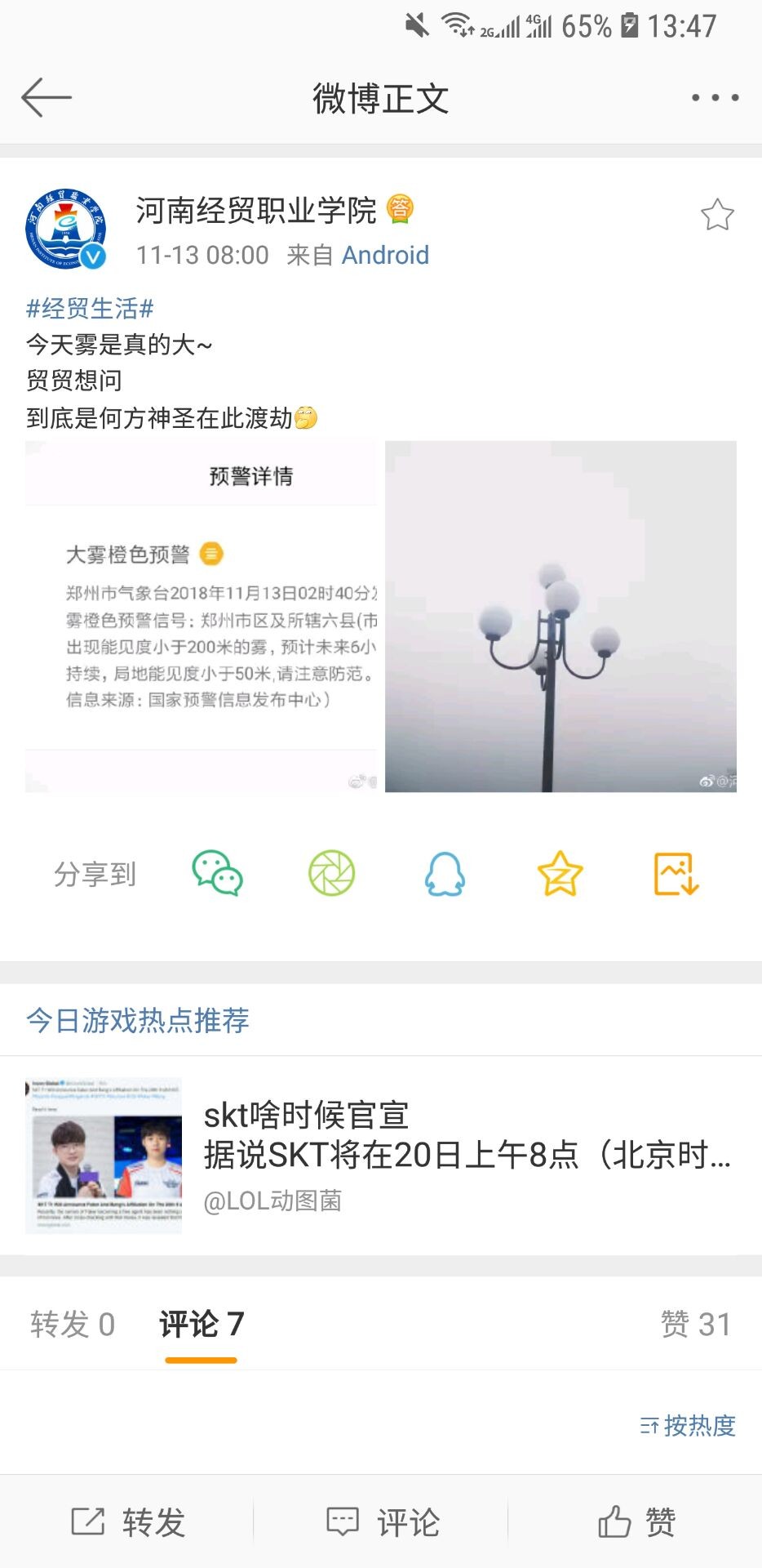 11月13日当天,@河南经贸职业学院在官方微博中调侃“今天雾是真的大?贸贸想问到底是何方神圣在此渡劫”。并配图郑州市气象台2018年11月13日02时40分发布的大雾橙色预警信号。预警信号显示,当时郑州市区级所辖六县(市)已经出现能见度小于200米的雾。