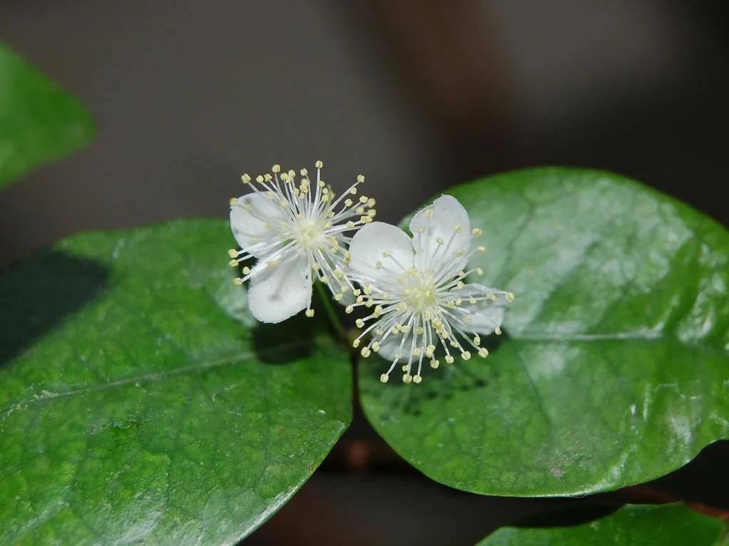 红果仔树形美观,枝繁叶茂,具有较高的观赏价值。其叶片椭圆形,先端钝或微凹,基部楔形,叶色深绿,叶面有光泽。花单生或成对生于叶腋,花径约1厘米,白色,雌雄同株。果实球形,成熟时呈鲜红色,宛如一颗颗小红宝石镶嵌在绿叶之中,极具观赏性。红果仔还可以作为庭院、公园、绿化带等地方的观赏植物,为人们的生活环境增添一抹亮丽的色彩。