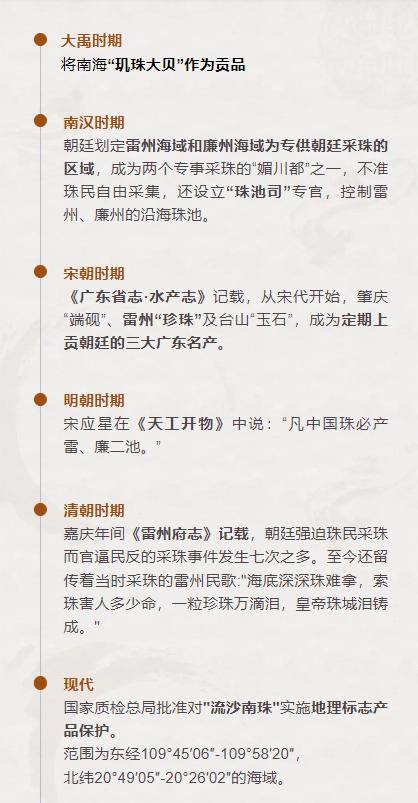据汉代刘安的《淮南子》记载,早在秦统一中国之前雷州就有珠民采珠,此后,历代帝王都把雷州的流沙湾视为海水珍珠的主要产地,下诏采珠,并将之列为贡品。古时雷州素有“珍珠故乡”之称。