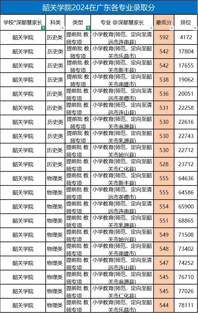 韶关学院2024年广东各专业录取分及位次(提前批教师专项)