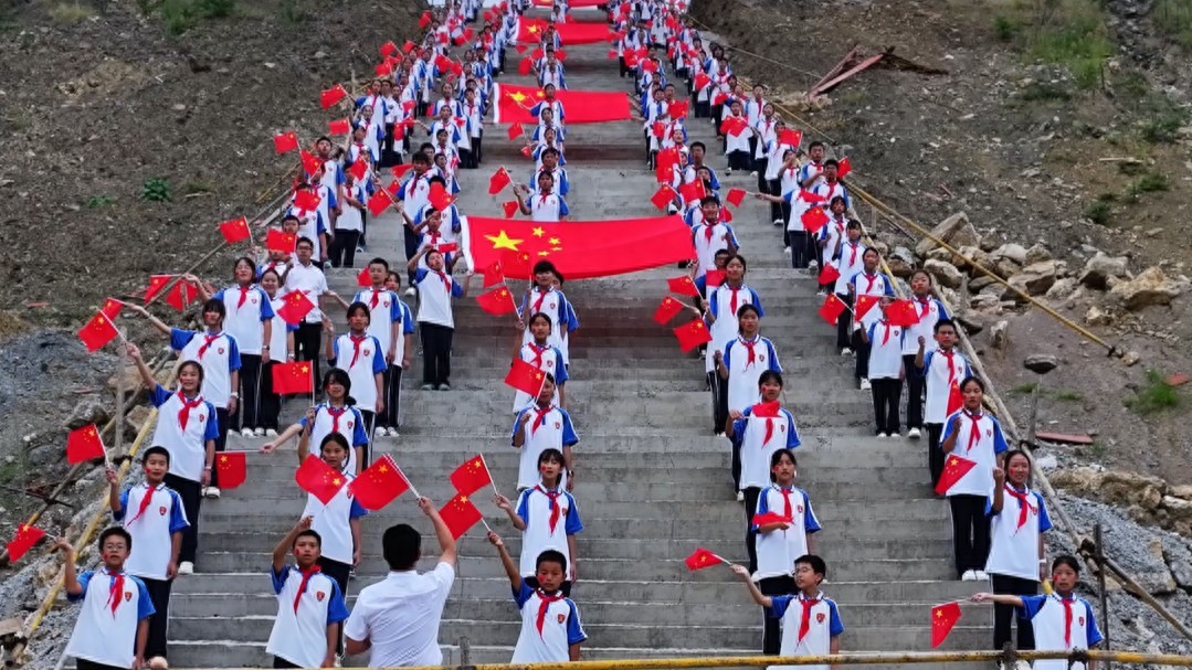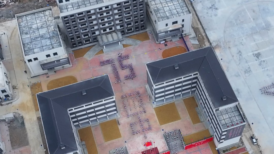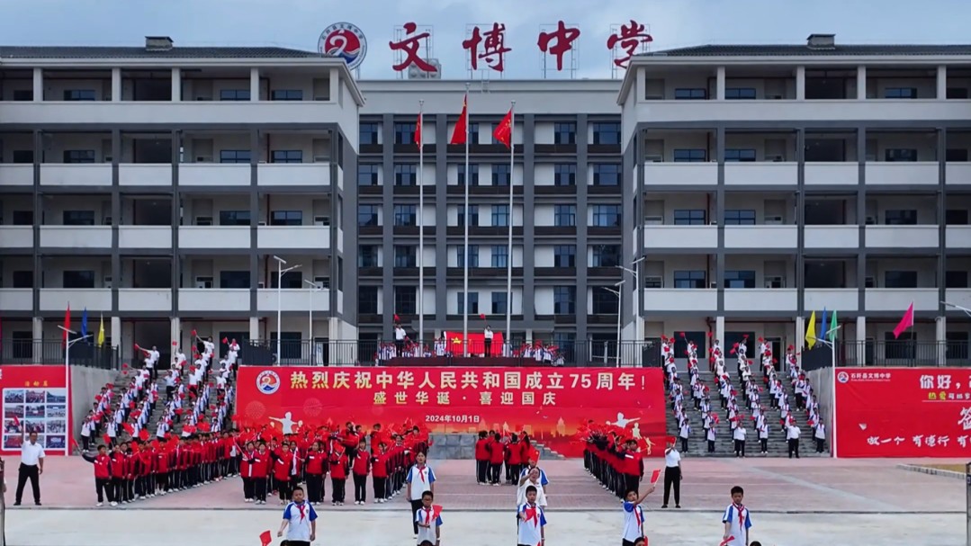 在石阡县文博中学操场上,1200余名师生手拿五星红旗,分列队形摆出“五角星”“75”“中国”“10·1”等字形,齐声高唱《我和我的祖国》,深情表达对伟大祖国的祝福和赞美,充分展示了师生们蓬勃向上、奉献青春的良好精神面貌。