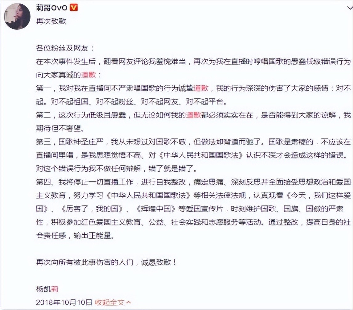 “国歌”事件后莉哥深夜致歉