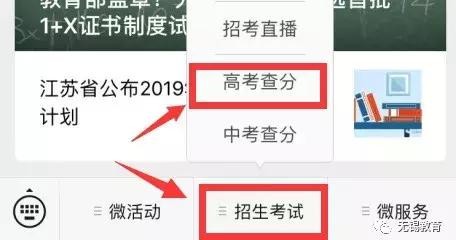 进入无锡教育微信点击底部菜单栏“招生考试”—“高考查分”