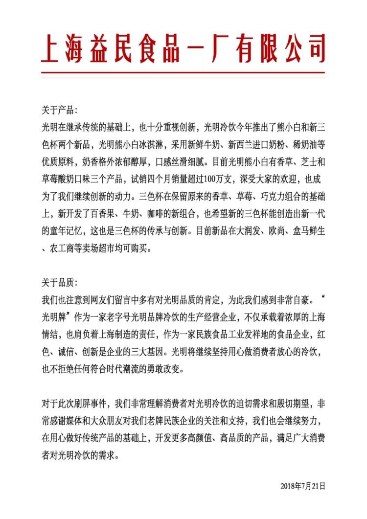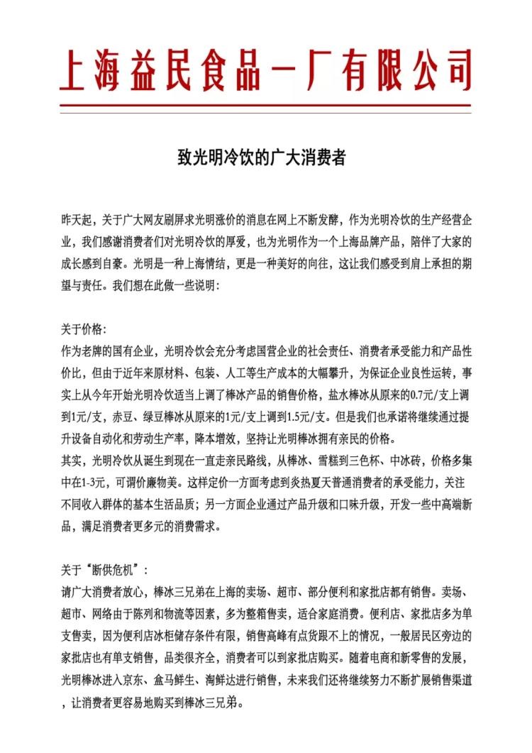 针对这一情况,光明冷饮发表了《致光明冷饮的广大消费者》一文,表示从今年开始光明冷饮已经适当上调了棒冰产品的销售价格,盐水棒冰从原来的0.7元/支上调到1元/支,赤豆、绿豆棒冰从原来的1元/支上调至1.5元/支。