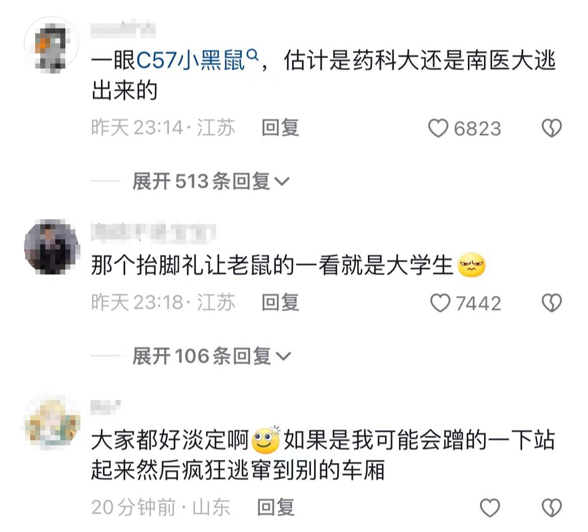 视频显示,一只小老鼠在地铁车厢内跑来跑去,有乘客抬脚躲避。视频发布者称,“南京一号线上的小耗子,最后掉进开门那边的缝隙里了”。有网友称,该老鼠疑似实验小鼠。