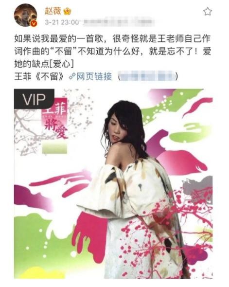 3月21日深夜,赵薇突然发文安利好友王菲的歌曲,并十分骄傲地表示:“不知道为什么好,就是忘不了!”,还向王菲热烈表白“爱她的缺点”。