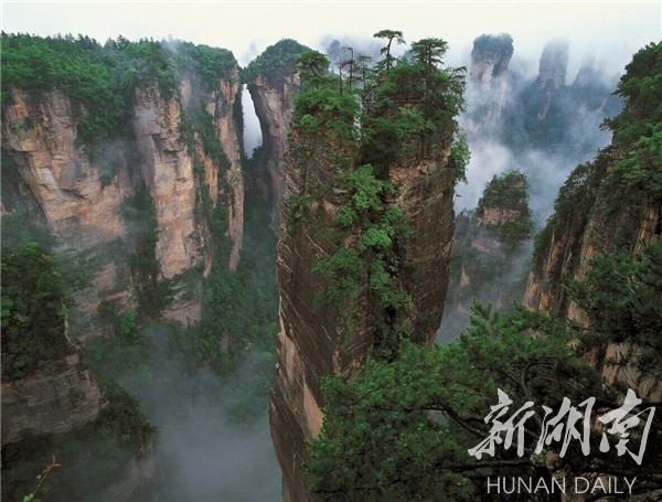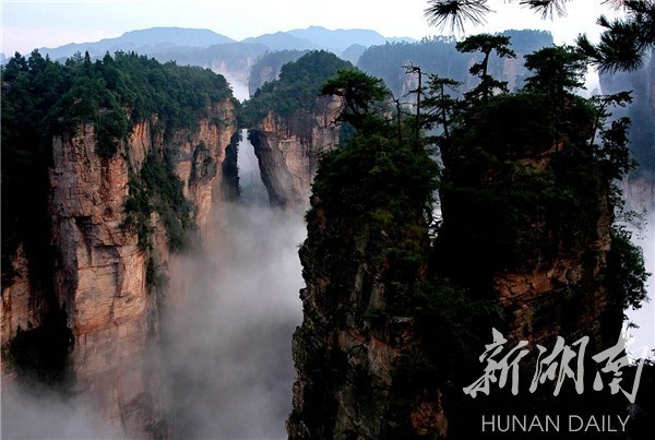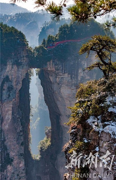 大自然的鬼斧神工,把东西两峰连接,桥上苍松挺拔,桥下云雾荡漾,万丈深渊,是张家界风景一绝,是大自然的一个奇迹。
