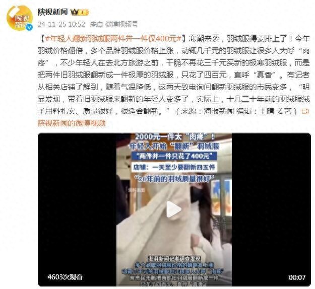 寒潮来袭,羽绒服得安排上了!今年羽绒价格翻倍,多个品牌羽绒服价格上涨,动辄几千元的羽绒服让很多人大呼“肉疼”,不少年轻人在去北方旅游之前,干脆不再花三千元买新的极寒羽绒服,而是把两件旧羽绒服翻新成一件极厚的羽绒服,只花了四百元,直呼“真香”。有记者从相关店铺了解到,随着气温降低,这两天致电询问翻新羽绒服的市民变多,“明显发现,带着旧羽绒服来翻新的年轻人变多了,实际上,十几二十年前的羽绒服绒子用料扎实、质量很好,很适合翻新。”