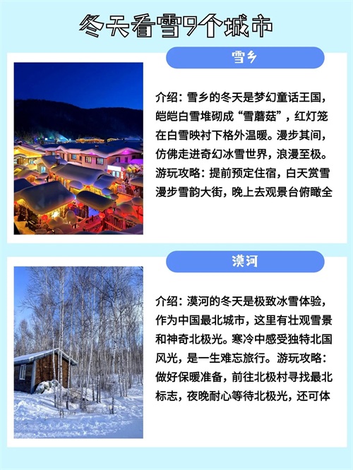 冬天要去看雪还不知道去哪里玩的,给大家整理了9个推荐城市:雪乡、漠河、庐山、阿勒泰、张家界、长白山、大连、威海、青岛。最近要去看雪的小伙伴可以用的上,有想法但没时间的小伙伴,可以先收藏起来哦~