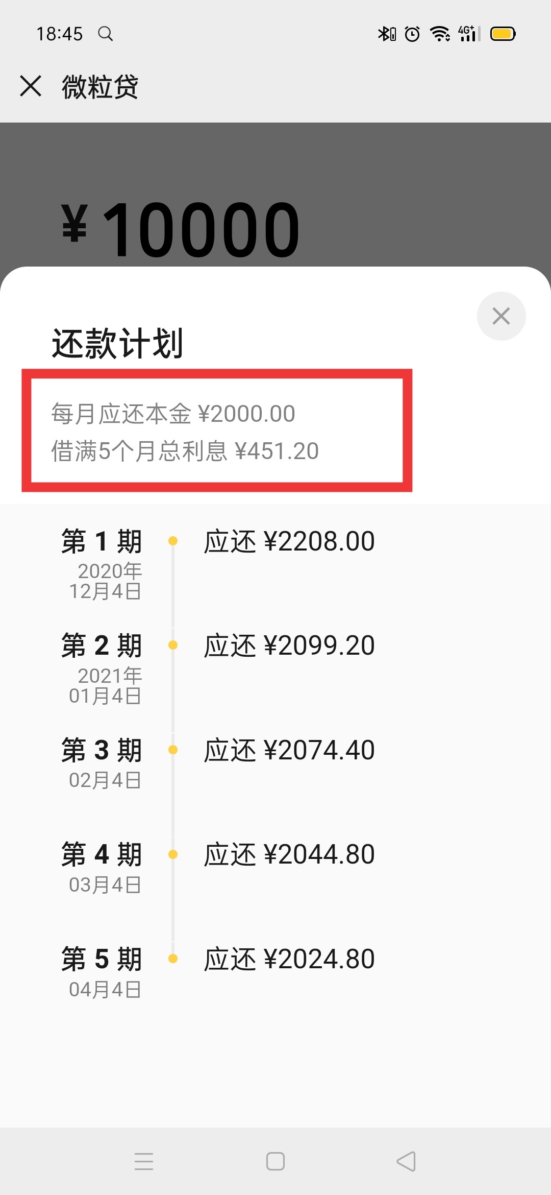 今天给大家算一算微粒贷的利息,看下利息到底高不高?以我的微粒贷额度为例,见下图,我的额度不高,只有11000元,日利率显示是0.04%,也就是借1万,一年的利息是4块钱,按金融行业的行话讲就是月息1分2,这个利息在银行贷款类产品算是比较高了,相当于借1万,一个月得给马化腾支付120元的利息,我们再来看第二张图片,如果你是按照二图分5个月还款,那么利息又是怎样的呢?借出1万元, 5个月总利息451.2元,每月利息90.24元,行话讲叫9厘多,这个利息相比银行贷款也是偏高的,如果个人征信比较好,有车有房,还是建议大家到银行贷款,当然,如果是短期周转一下,大家可以放心大胆的使用微粒贷哦!最后总结下,如果大家按天来借款,借款利息就是每天的利息乘以天数,按照分期还款的话,就是总利息除以分期的期数!好了,今天分享到此,有不同的观点,欢迎指正哦!