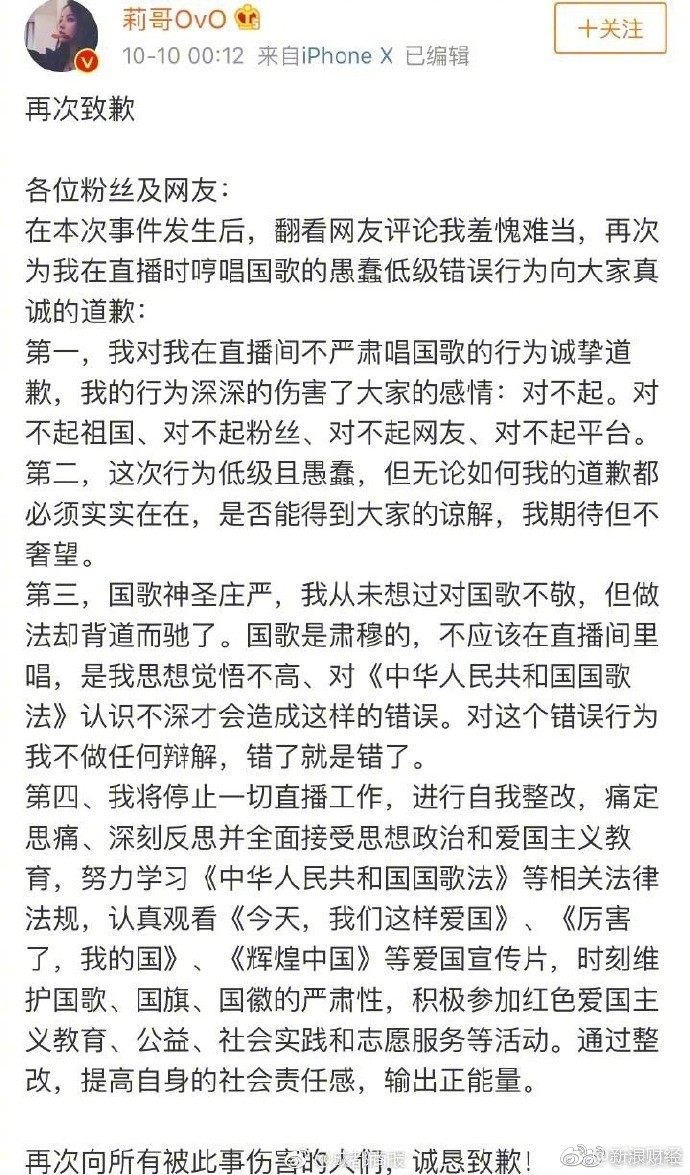 近日,有网友反映,虎牙主播 “莉哥OvO” 在直播中,公然篡改国歌曲谱,以嬉皮笑脸的方式表现国歌内容,并将国歌作为自己所谓“网络音乐会”的“开幕曲”。目前,该主播直播间已被@虎牙直播 封禁。杨凯莉本人深夜致歉,承认自己行为低级且愚蠢。