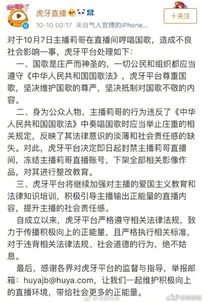 虎牙主播杨凯莉戏唱国歌 账号被封深夜致歉