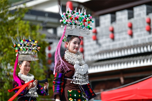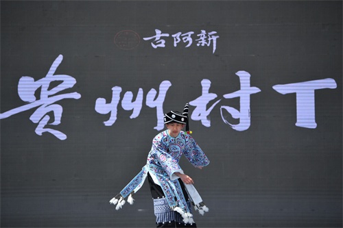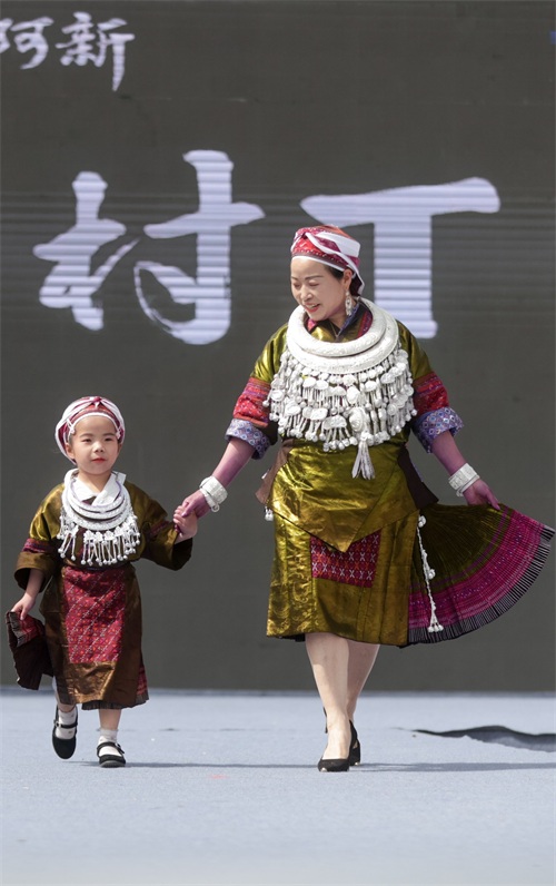 4月13日,表演者在贵州省台江县参加姊妹节“T台”服饰秀。新华社发(欧阳光林摄)