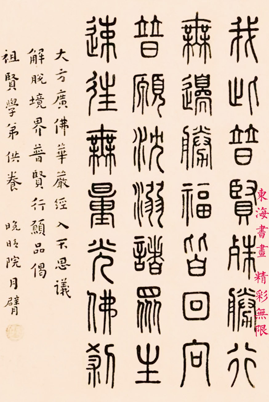 题识:愿我临欲命终时,尽除一切诸障碍。...........普愿沉溺诸众生,速往无量光佛刹。大方广佛华严经入不思议解脱境界普贤行愿品偈,祖贤学弟供养,晚晴院月臂。