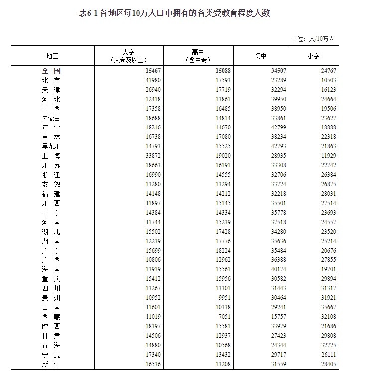4、在受教育方面,每10万人口中拥有大学(大专及以上)教育程度的为14148人,高中(含中专)教育程度的为14212人,初中教育程度为32218人,小学教育程度为28031人。
