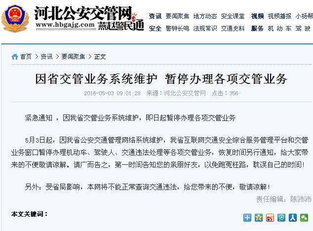 据河北公安交管网消息,5月3日起,因河北省公安交通管理网络系统维护,河北省互联网交通安全综合服务管理平台和交管业务窗口暂停办理机动车、驾驶人、交通违法处理等各项交管业务,恢复时间另行通知。请广而告之,第一时间告知您的亲朋好友,以免跑冤枉路,耽误自己的时间!
