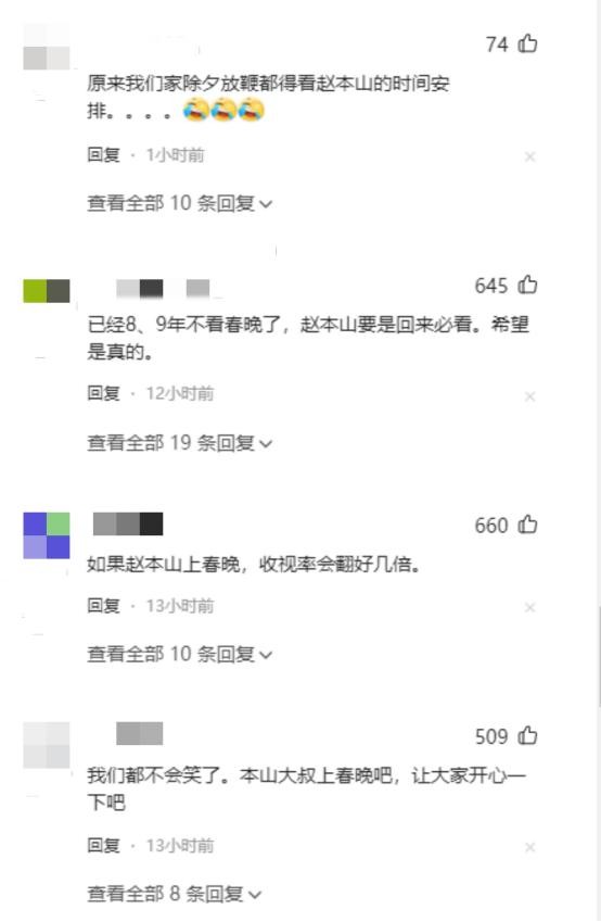 不少网友得知赵本山回归春晚舞台的消息之后极为激动,纷纷表示自己等待了多年终于等到赵本山登台,还有网友表示已经有8、9年不看春晚了,如果消息是真的那么2023年的春晚他必定是要看的。