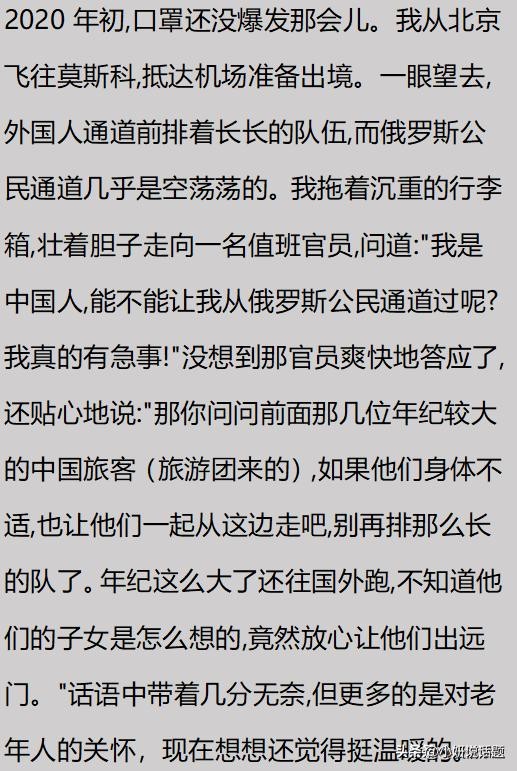 “2020 年初从北京飞莫斯科,机场官员允许我从俄公民通道过并关怀老人。”