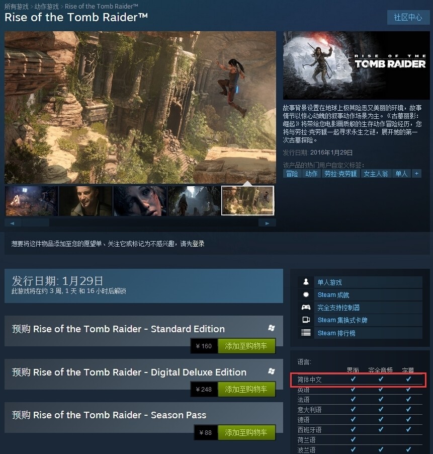 按计划,《古墓丽影:崛起》会在1月29日正式推出,Steam国区标准版售价160元,内置官方简体中文菜单、字幕以及全程普通话配音。
