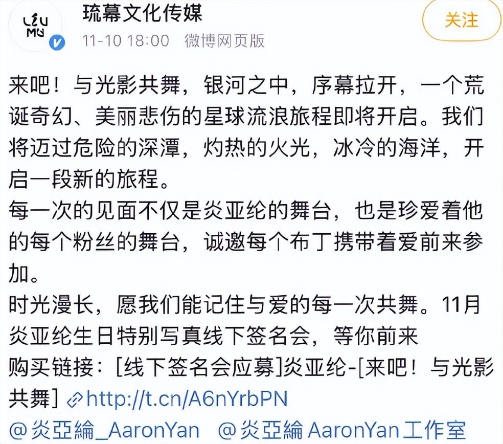 说回炎亚纶的近况,不知道是对即将到来的婚姻有经济困扰,还是想让对方过得好一些,最近炎亚纶也是拼命挣钱。先在台湾开完生日签售会,又打算到北京举办线下签售会,想要去和炎亚纶见面的粉丝,就必须大量购买炎亚纶的写真集,才有抽奖的机会。也就是说,即使你花了钱,也不一定能够见到他,真是把粉丝当韭菜割啊。