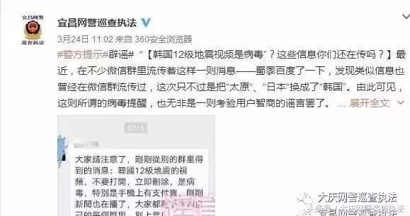 其实这是一条衍生版谣言,曾经出现过类似的“新版人民币视频是病毒”、“太原、日本、韩国地震视频是病毒”、“天津爆炸视频是病毒”等等版本,多地网警也对其发布过辟谣文章。