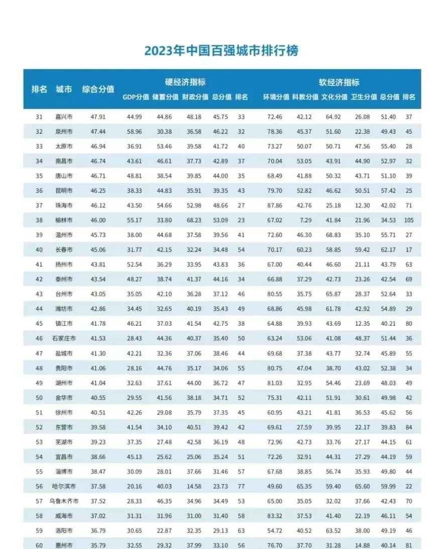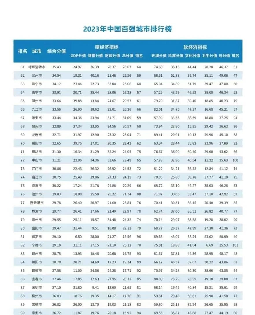 2023年中国百强城市排行榜发布:江西5个城市上榜