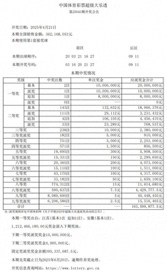 4月21日,超级大乐透第25043期开奖。前区开出号码03、16、20、21、27;后区开出号码09、11。本期全国销售3.62亿元,为国家筹集彩票公益金1.30亿元。无锡3202002731门店开出一注超级大乐透一等奖(含追加),中奖金额1800万元。