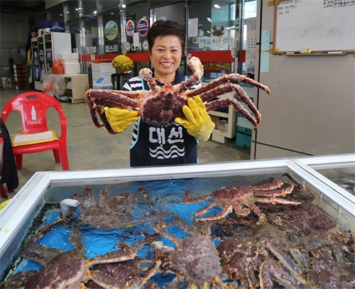 11月10日,在韩国釜山机张郡附近,一名水产商人展示售卖的帝王蟹。 新华社记者 姚琪琳 摄