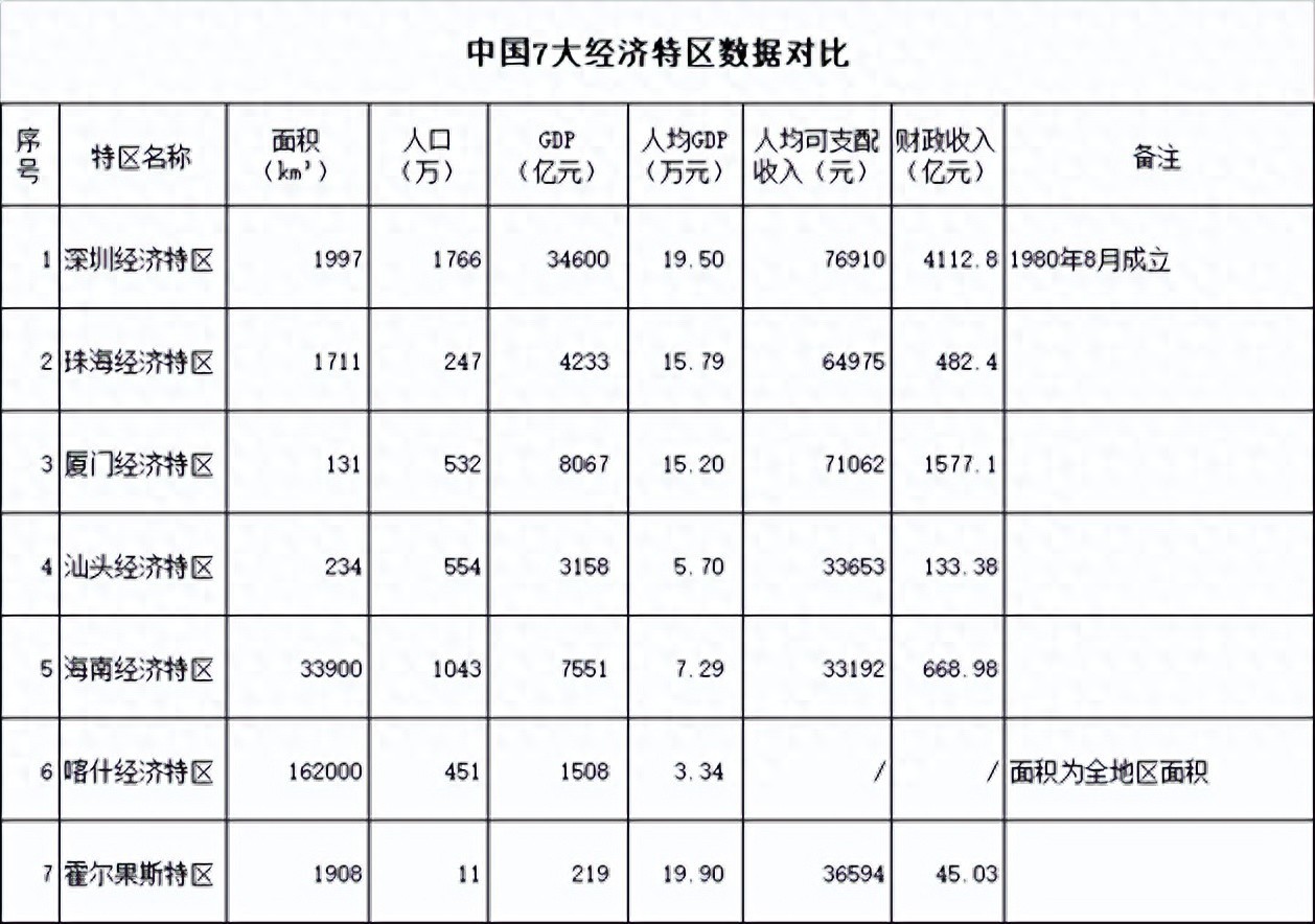 抽空整理了下7个特区相关数据,分别从面积、人口、GDP、人均GDP、人均可支配收入及财政收入等维度来考量特区经济总量、财政能力及老百姓的富裕程度。具体数据如下: