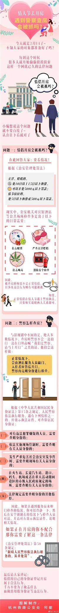 情人节蜀黍话你知【情人节去开房,遇到警察查房会被抓吗?】今天就是2月14日了,大家都准备好撒狗粮了吗?每到这个时候,很多人就开始偷偷摸摸摸索一个困扰已久的法律问题:情侣开房会被抓吗?蜀黍想说,这个问题就不要问度娘了,直接点开大图看吧~(via杭州铁路公安处)