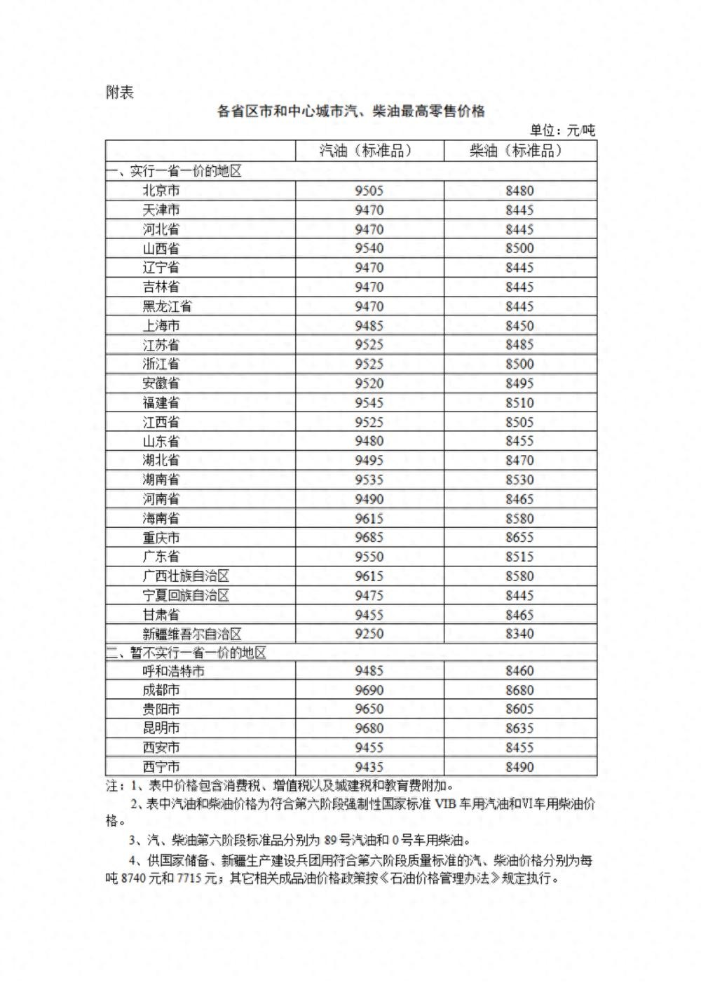 附:各省区市和中心城市汽、柴油最高零售价格