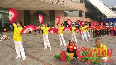 梅花艺术团的长扇舞,biubiu甩起来!艺术团团长梁阿姨表示,团员们七点半就到了星海音乐厅附近广场,整个赛事过程中加油助威活动都不会断,会轮番上场舞舞舞。采访过程中,梁阿姨也不断在对团员指点“动作大一点,扇子舞起来!