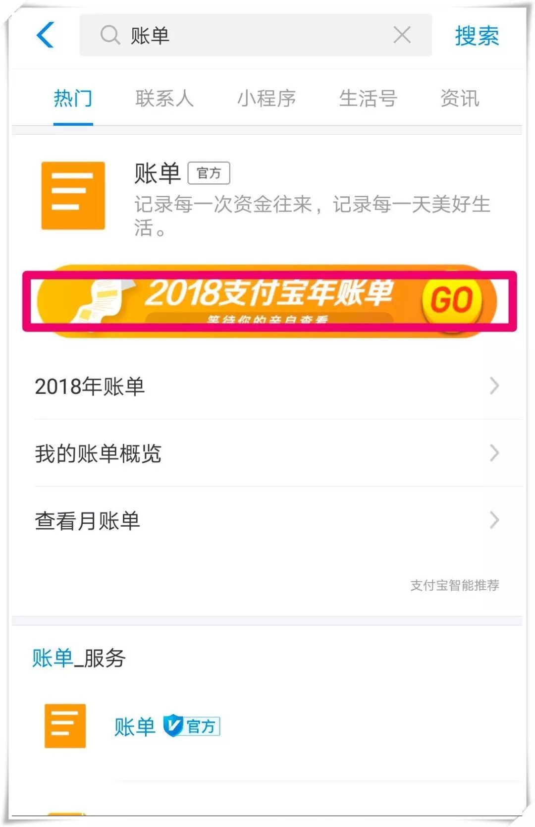 用户可以在支付宝点击“我的”选项,再在账单中查询即可,也可以在搜索框中搜索“账单”后,查询2018年的消费账单。