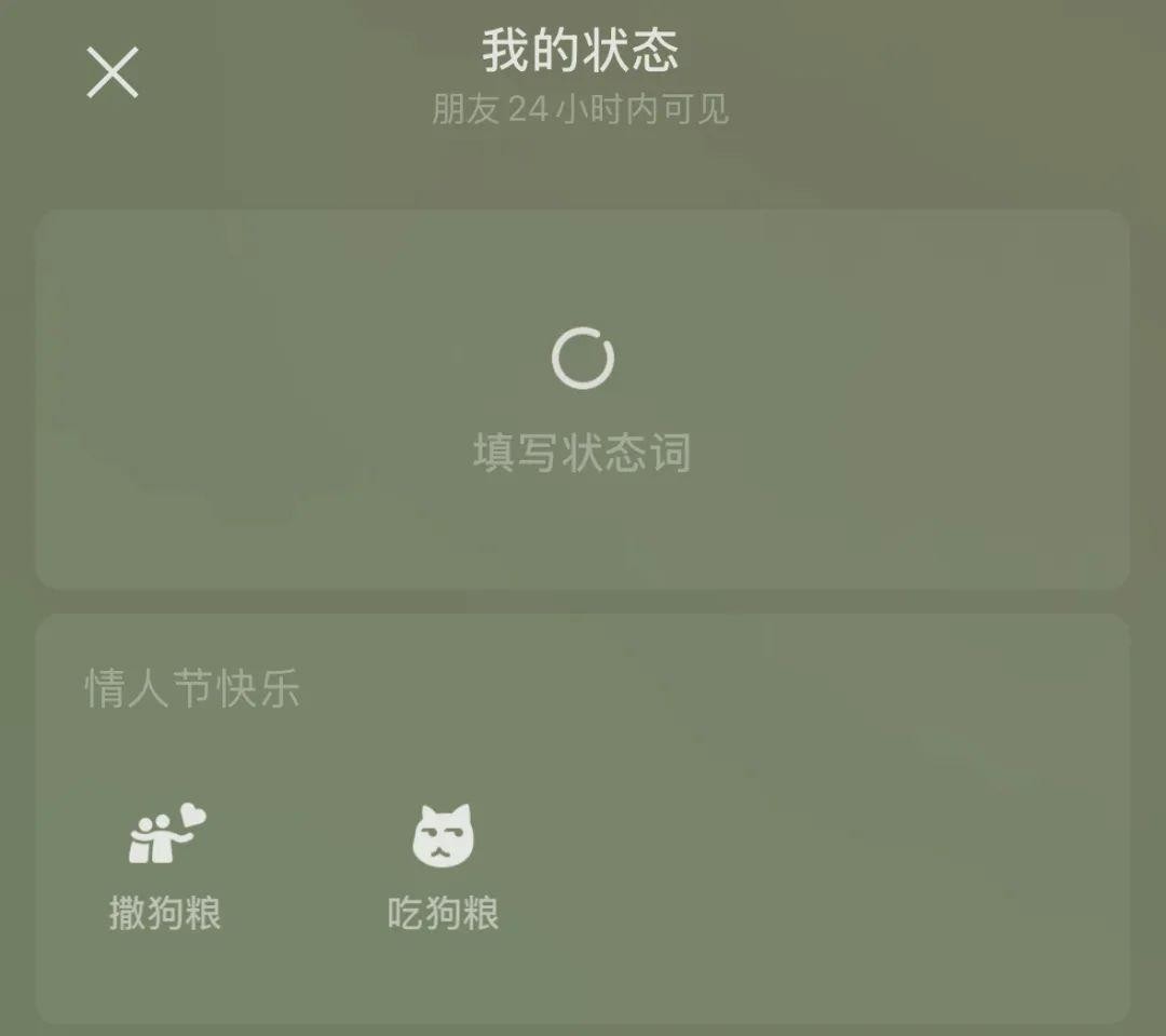 同时,微信今天还同步上线了两个限定状态,分别是“撒狗粮”和“吃狗粮”,这也是三个节日中必备的“保留节目”。