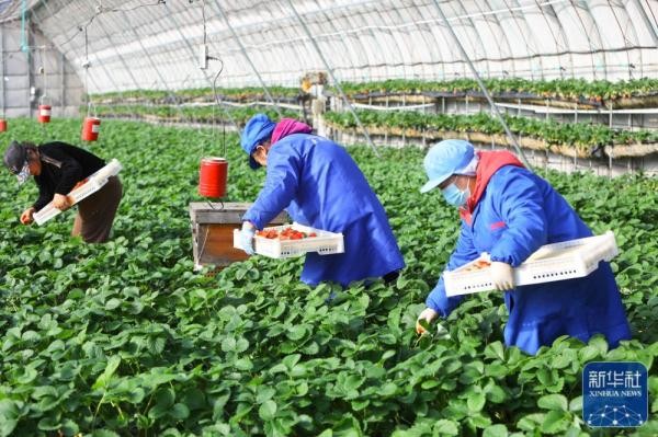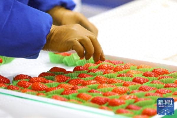 近日,辽宁省丹东市早熟草莓抢鲜上市,人们忙着采收新鲜草莓,打包后发往国内外市场。