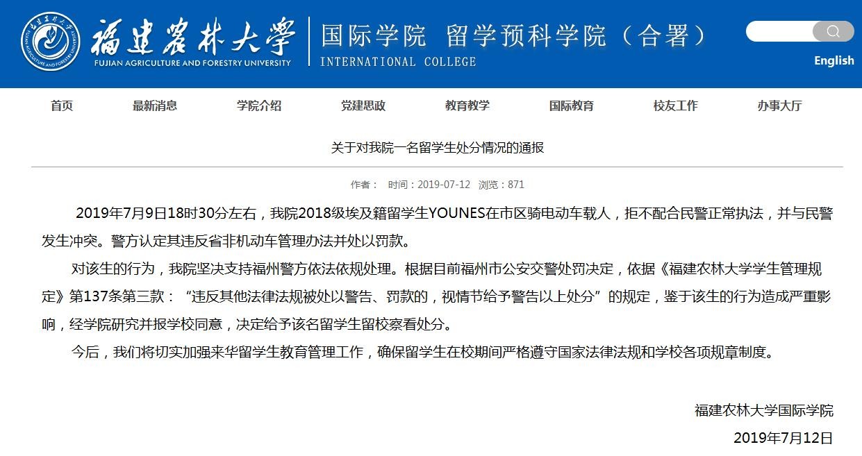 福建农林大学官网回应留学生与民警冲突:给予该生留校察看处分