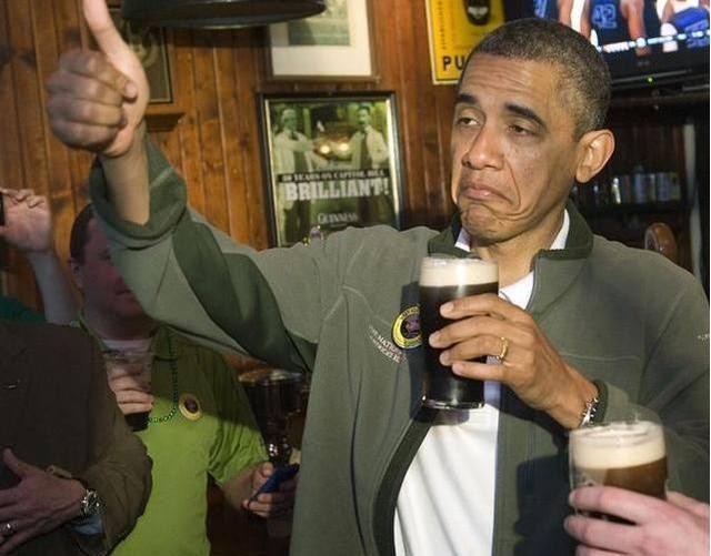 图三是奥巴马在酒吧喝酒,虽然平时领导人不能喝酒,但是有机会畅饮一杯绝不放过。