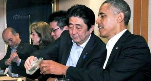 图二是安倍请奥巴马喝酒,在居酒屋喝酒是日本人的习惯。经常可以看到从这里喝得醉醺醺的日本人,在高压的社会下,人们喜欢用酒精麻痹自己。