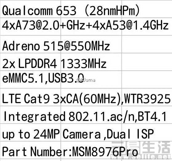 9月11日消息,骁龙820的升级版本821已经发布,根据最新消息,中端主力骁龙600系列的最高端型号骁龙652也即将迎来升级,那就是骁龙653。从曝光的信息来看,骁龙653使用的依然是28nmHPm工艺,为八核处理器。
