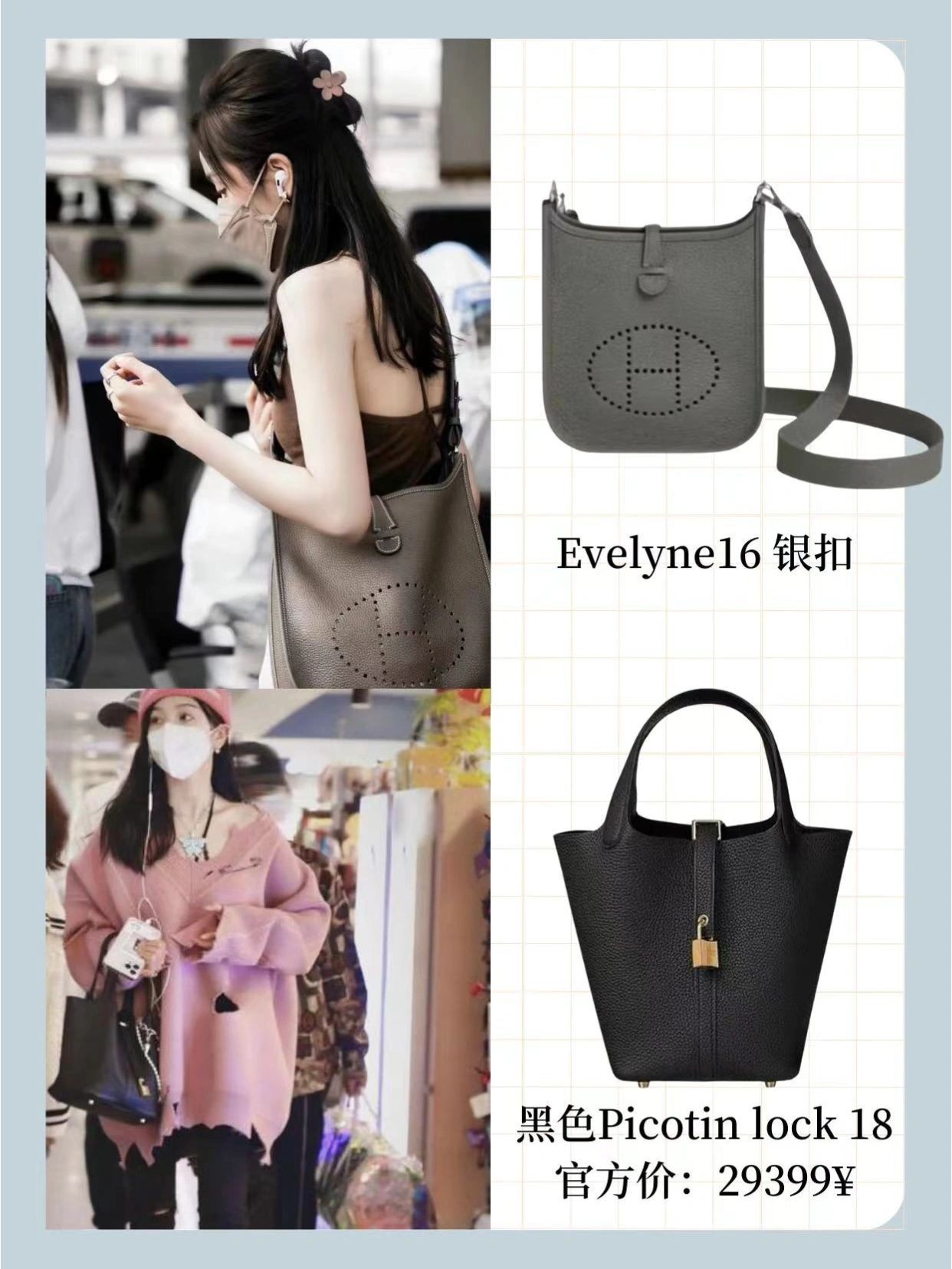 最常背的就是这只白色kelly,和她很多穿搭都能融合在一起,Birkin cargo、菜篮子都是偏向实用风的,功能齐全,性价比高,这几年大火的伊芙琳,小选也是轻松拿下,扁扁的包身斜挎起来刚刚好