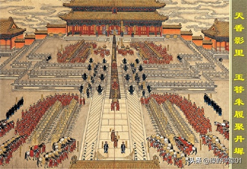 “祥云迷凤阁,瑞气罩龙楼。含烟御柳拂旌旗,带露宫花迎剑戟。天香影里,玉簪珠履聚丹墀;仙乐声中,绣袄锦衣扶御驾。珍珠帘卷,黄金殿上现金舆;凤羽扇开,白玉阶前停宝辇。隐隐净鞭三下响,层层文武两班齐。”