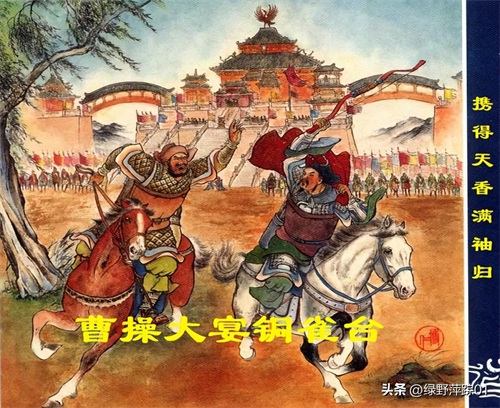 第二处,是“曹操大宴铜雀台”故事中,王朗进献七言诗:“铜雀台高壮帝畿,水明山秀竞光辉。三千剑佩趋黄道,百万貔貅现紫微。风动绣帘金凤舞,云生碧瓦玉龙飞。君臣庆会休辞醉,携得天香满袖归。”